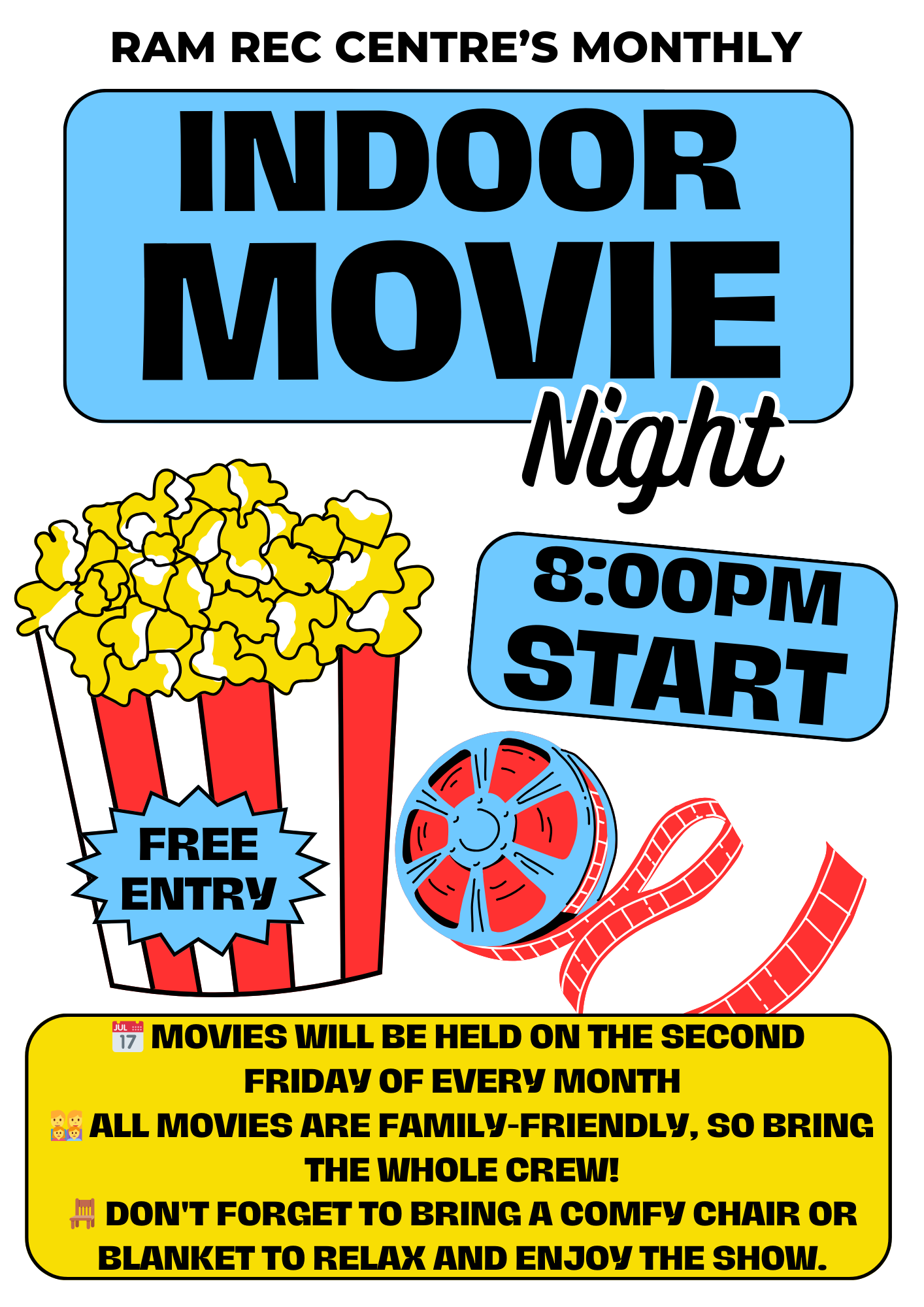 Join us at the RAM Recreational Centre for our Monthly Movie Nights, held on the second Friday of every month! Gather your friends and family for a fun evening filled with great films, tasty snacks from the canteen, and a cozy community vibe. Perfect for all ages, it’s the ideal way to kick off your weekend. Don’t miss out—see you at the movies! 🎥🍿